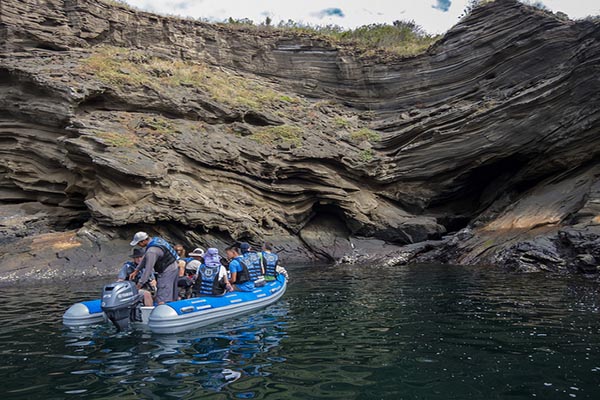 On Vicente Roca Point the geological formations are simply outstanding and it is a great place to view various bird species such as blue-footed boobies, Nazca boobies, gulls, storm petrels, and brown noddy terns. Activities here are all done on the water by either dinghy or panga, or snorkeling. On this western part of the island the Cromwell Current provides cold water and many nutrients. Due to this it is possible to see various feeding frenzies of an assortment of animals such as whales, dolphins, sea lions, and marine birds diving. At times it may also be likely to see fur seals.