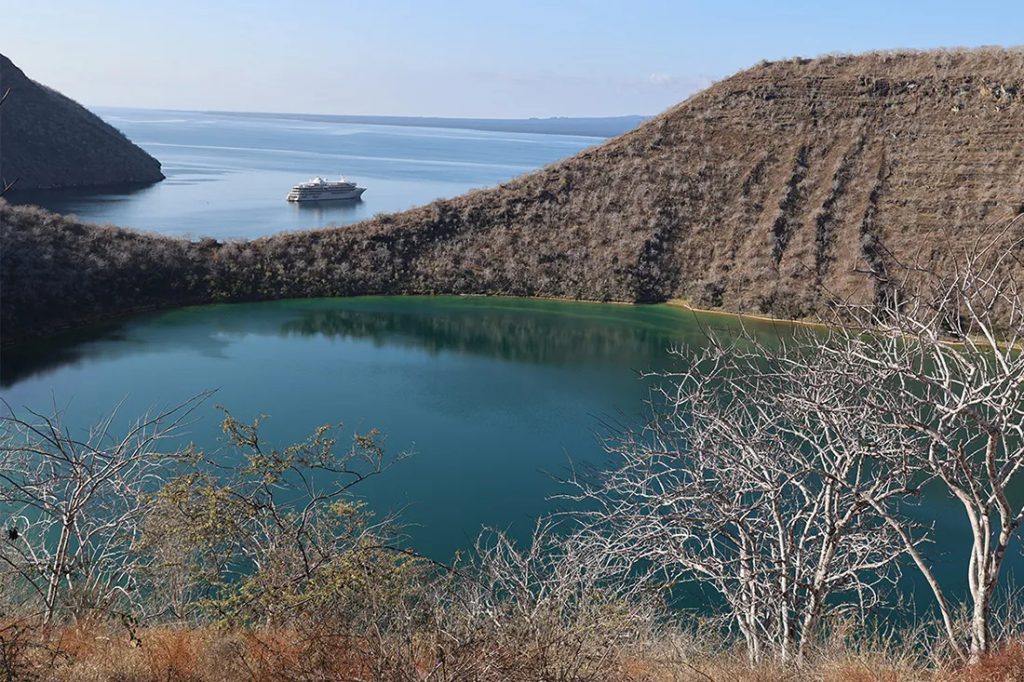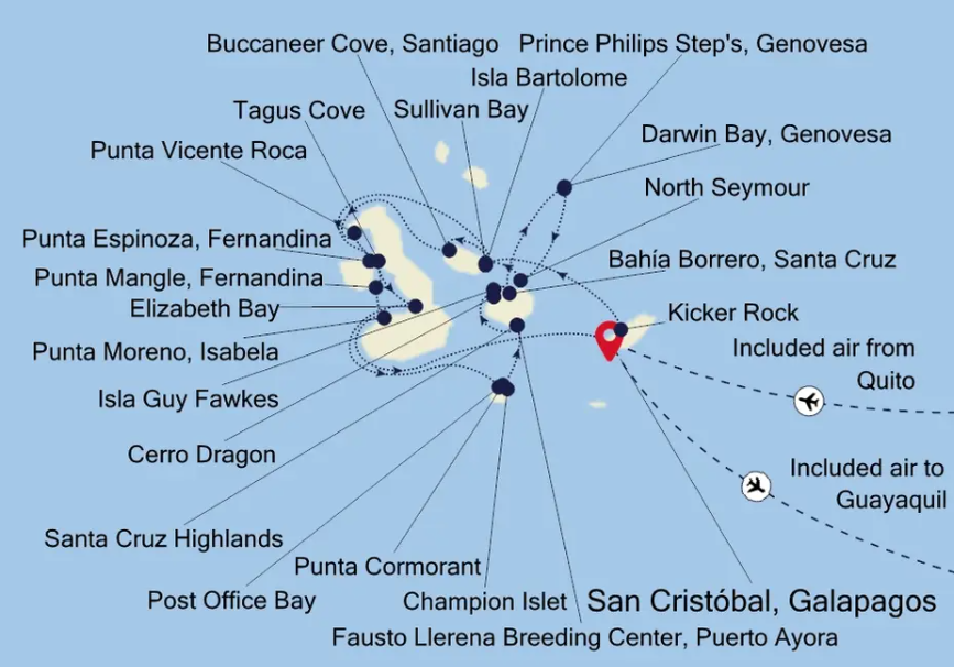 On Genovesa Island, the ship enters Darwin Bay, a former volcanic crater now flooded by the sea. The zodiacs land on a picturesque sandy beach where Galapagos sea lions often rest on the fine white sand. Scans along the coast may reveal marine iguanas that look like miniature prehistoric dinosaurs. By heading inland a short distance, visitors could find seabirds of all shapes and sizes nesting in the vegetation. Dozens of immature red-footed boobies perch on branches within easy reach of the trail. Also, keep an eye out for great frigate birds and yellow-crowned night herons along the walk. You can also snorkel in the waters of Darwin Bay with the chance to see large schools of reef fish and brilliantly colored starfish.