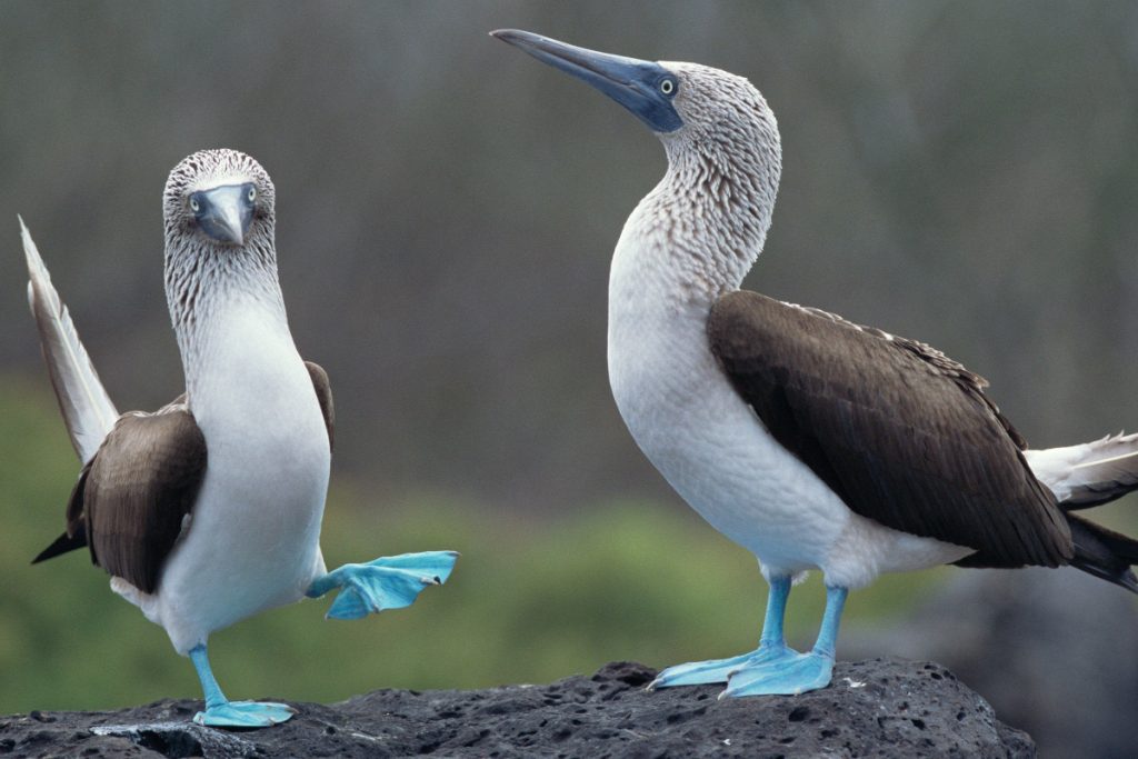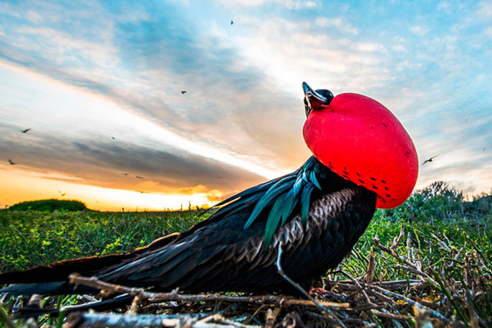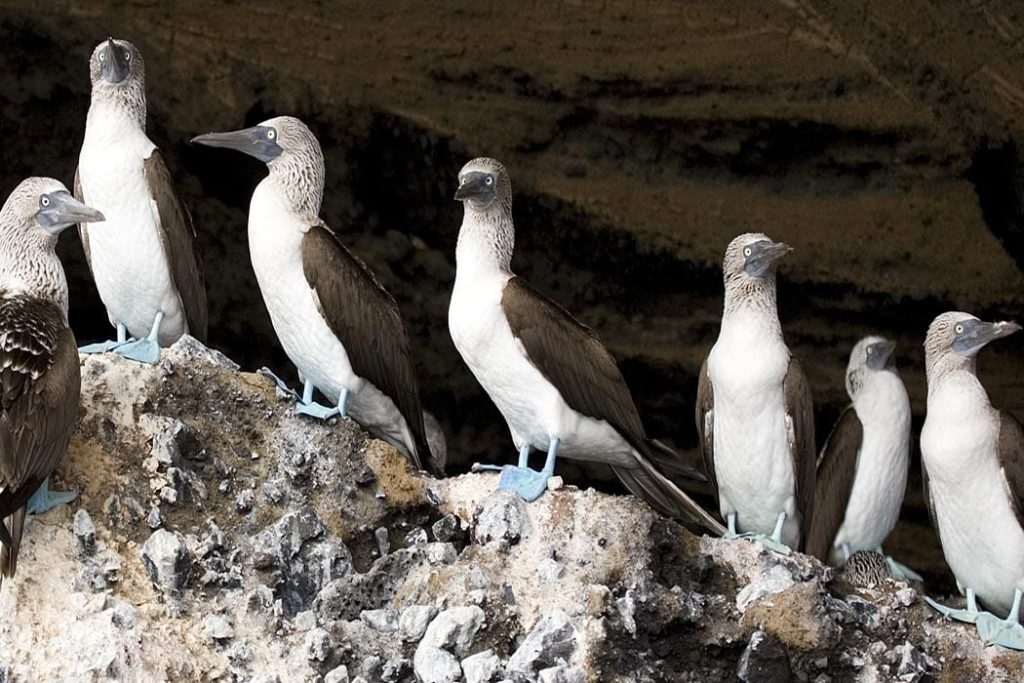 The landing at North Seymour Island is onto black lava rock. After a short climb, visitors arrive on the island’s flat plateau where a number of sea lions nurse pups and frigatebirds nest. The island is dry, and so the predominant tree is the prickly pear cactus favored by the Galapagos land iguanas that live here in number. The undulating terrain is littered with red-brown volcanic boulders and large male Magnificent Frigatebirds can be seen inflating their vivid red gular sacs in hopes of impressing females flying overhead. At certain times of the year, pairs of Blue-footed Boobies dance here in a ritualized mating dance that reinforces their pair bond and shows off their vivid blue feet. The snorkeling here is well-known for schools of colorful creole wrasses and parrot fish.