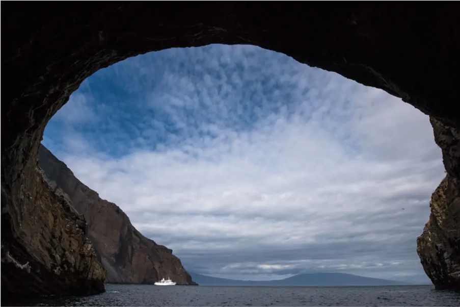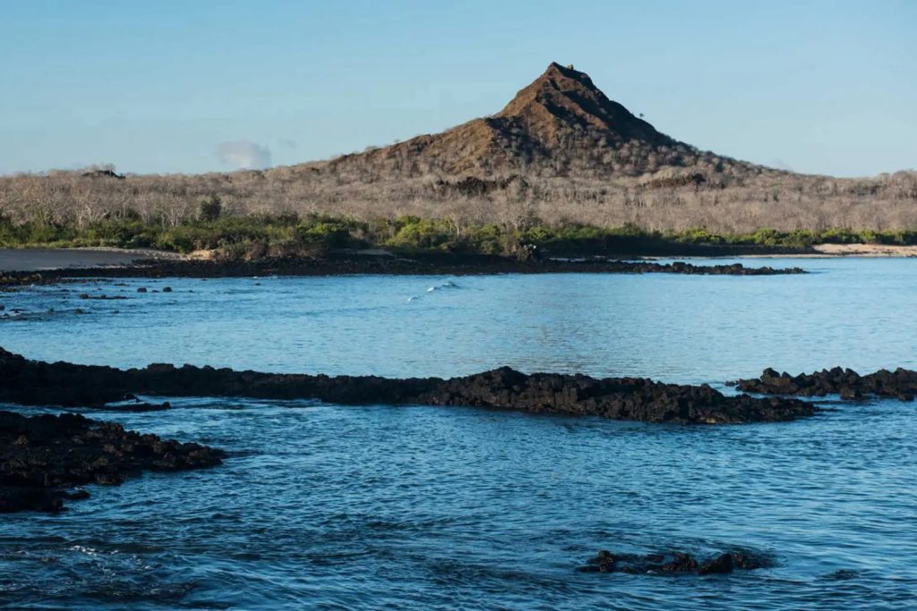 Buccaneer Cove is a colourful inlet on Santiago or James Island. It owes its name to some of the first visitors to the area: pirates. They came searching for water, tortoises, and some people say even places to hide their treasures. We don’t know about any pirate’s gold, but the area’s landscape is a treasure. The geology combines some tuff red cones with impressive basalt lava dikes and sills. The erosion has carved caves and shaped some rocks into unique forms such as the Bishop’s Rock. Palo Santo trees and some giant Prickly pear cactus cover the area, and at a distance, you can observe the impressive volcanos of Isabela Island. We will explore the area from our Zodiacs, searching for sea birds such as Nazca Boobies, Blue Footed Boobies, and Swallow-tailed Gulls. We can often find sea turtles and even reef sharks in this place. Also, in Buccaneer Cove, we can observe the two sea lions species: the Galapagos sea lion basking on the beaches and the fur seal looking for shade on the collapsed rocks along the coast.