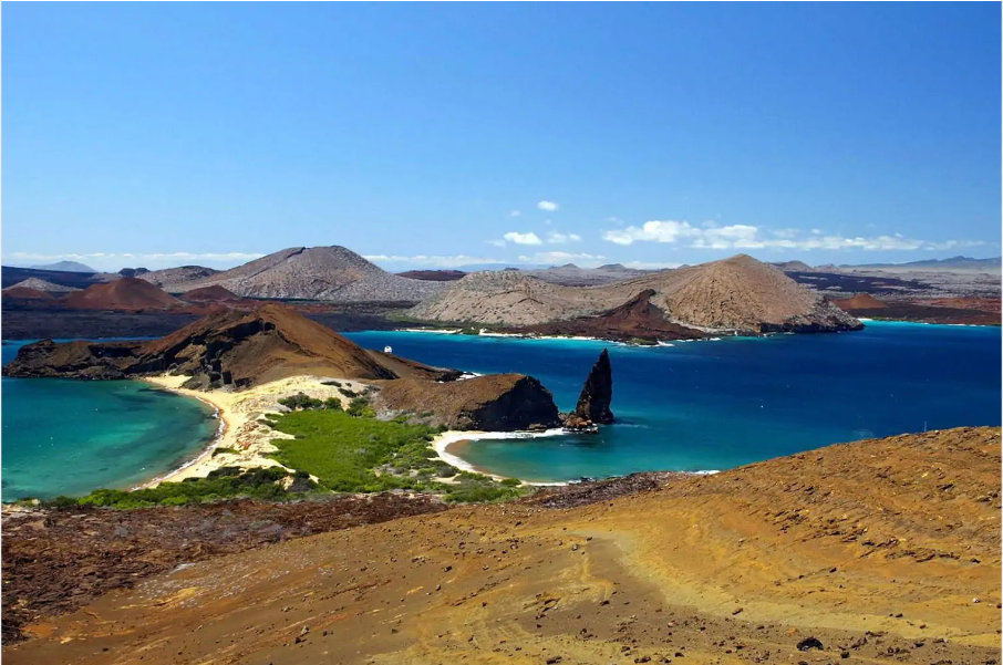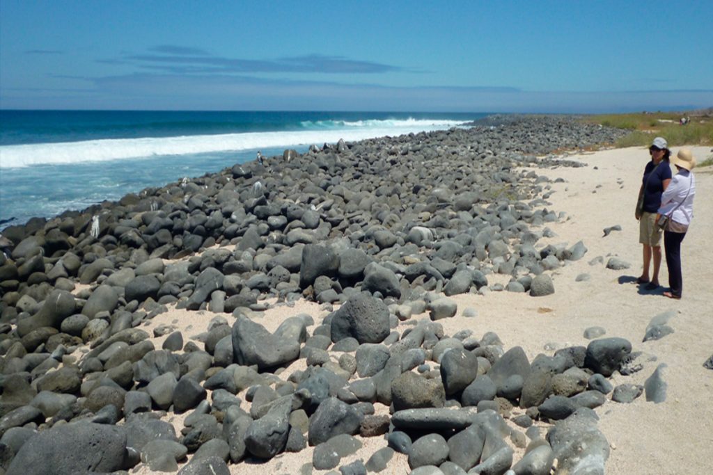 Our ship anchors in sight of the volcanic moonscape of Isla Bartolomé, at Sullivan Bay. Zodiacs bring guests ashore to ascend a boardwalk of 388 steps. Passing through the arid volcanic landscape provides a chance to watch for lava lizards, Galapagos Hawks, and Blue-footed Boobies. However, the climber’s ultimate reward is one of the most beautiful panoramas in all of the Galapagos Islands – the view towards Pinnacle Rock with black, volcanic cones of Baltra, Daphne Major and Daphne Minor in the distance. On the way down watch how the sunlight catches the green of pioneering plant species in stark contrast against dark volcanic rock, and look forward to time swimming and snorkeling from the golden beach.