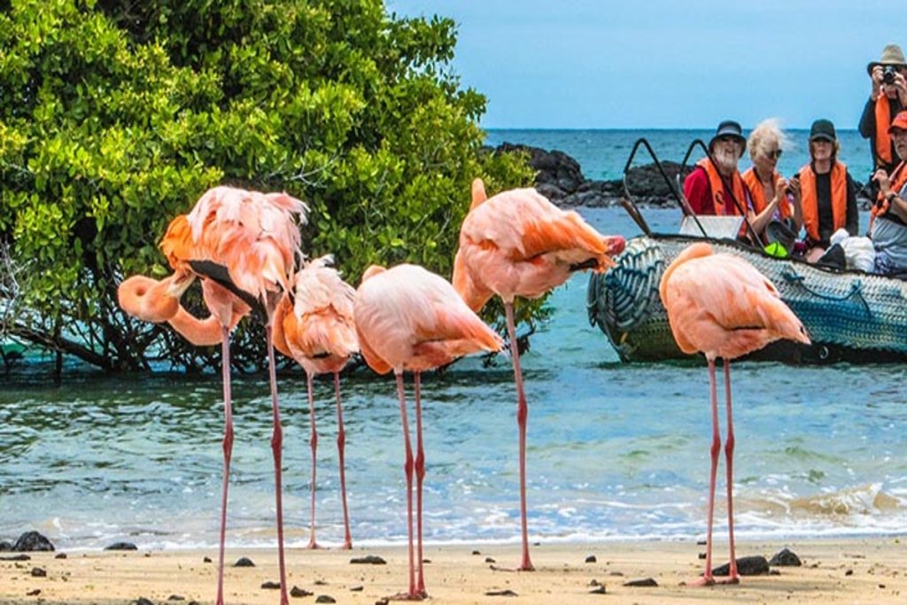Floreana Island’s northernmost point is called Punta Cormorant – named after the British naval vessel HMS Cormorant and dating back to the late 19th century. From the landing beach a short track leads to a shallow lagoon that is famous for its flamingos. The brilliantly pink birds skim the salty waters for shrimp and tend to chicks on the nest. The trail then scales a low hillside through scattered Palo Santo trees to reveal an idyllic white-sand beach on the other side of the point. Standing at the edge of the lapping waves, you might spot mammoth female sea turtles hauling themselves out of the sea to lay eggs in the sugar sand dunes that lay high above the tide line. Before returning to the landing site your guides may also point out White-cheeked Pintails, Blue-footed Boobies, Yellow Warblers, and Medium and Small Ground Finches.