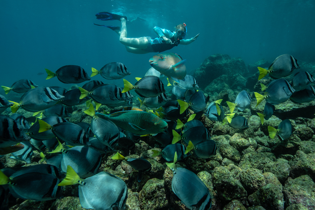 Guy Fawkes is a group of four islets situated on the northwestern side of Santa Cruz Island. They are satellite cones, surrounded by deep waters. As they rise from the deep, they intercept with the strong sea currents making the area a place full of life. These small islets have beautiful underwater cliffs covered with all sorts of marine invertebrates such as sponges, corals, sea stars, urchins — making it a very colourful place for deep water snorkelling. Due to the conditions mentioned above, it results in some immense aggregations of fish, and, due to the depth of the water, it is not unusual to find Sharks or Manta Rays. Guy Fawkes is one of the most exciting places to deep water snorkel. You never know what you will find.